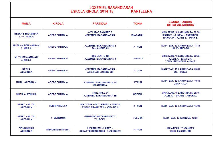 Gogoan izan datorren larunbatean ikasturte bukaerako festa egingo dugula, 11:00ean hasiko da baina dena antolatzeko 10:15ean etortzea komeni da. Herri kirolaren ondorenean hamaiketakoa izango da.