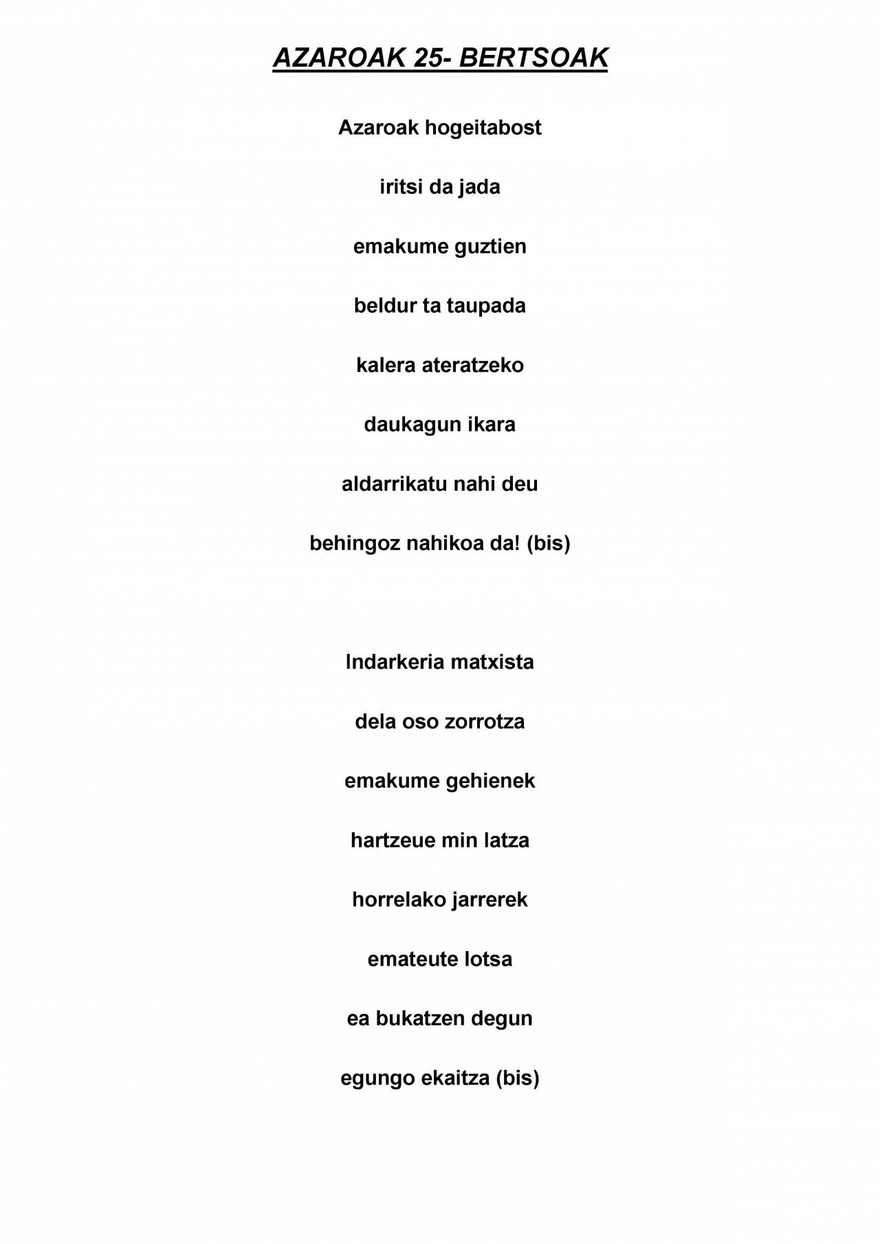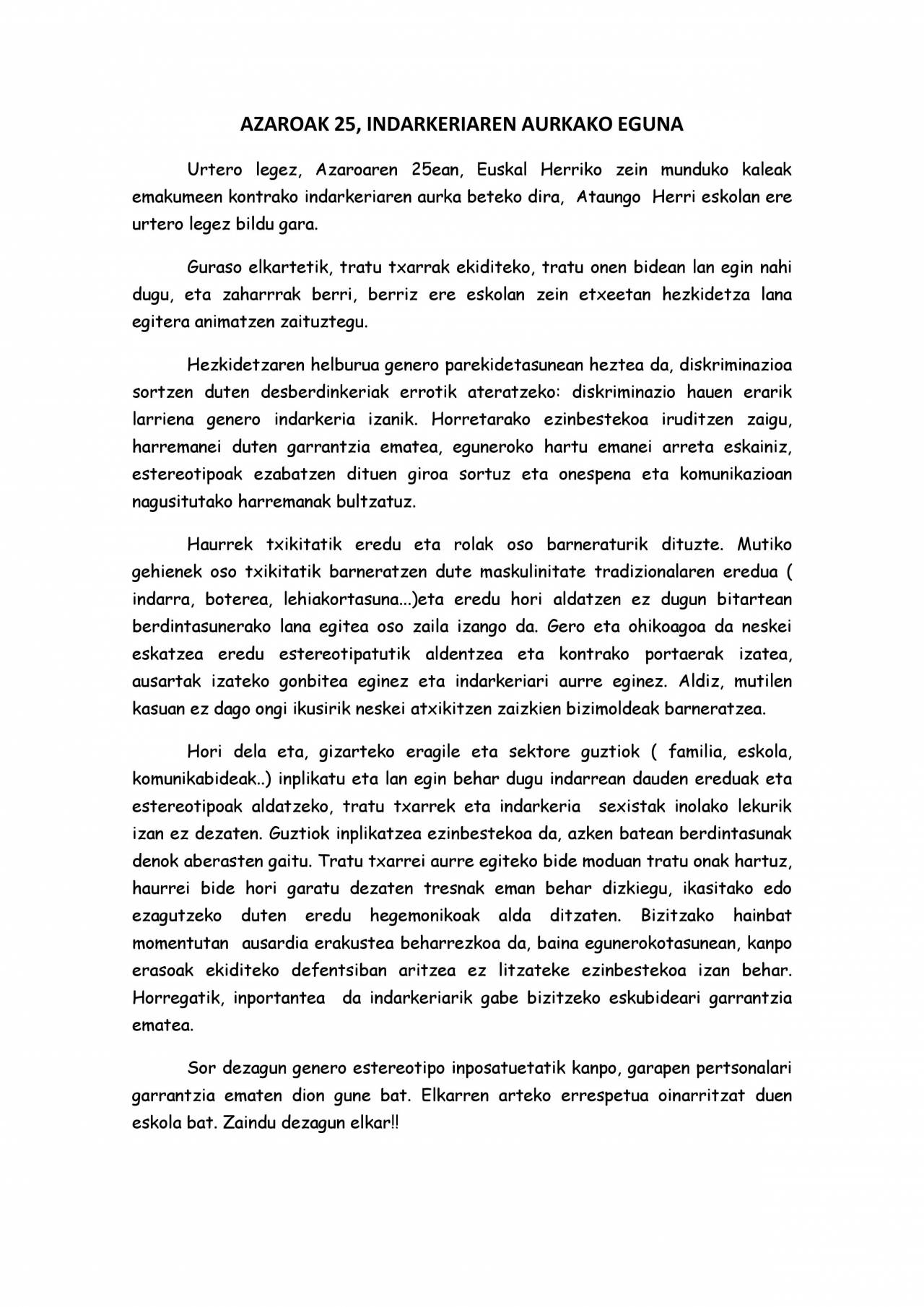 Azaroaren 25a aldarrikapen eguna da eta gure eskolan bat egin dugu berarekin. Ikasleek 10 lelo aurkeztu dituzte, LH5 eta 6ko ikasleek bertso bana abestu dute eta Guraso Elkarteak testu bat irakurri du berdintasuna aldarrikatuz. Mila esker gerturatu zineten guztioi.