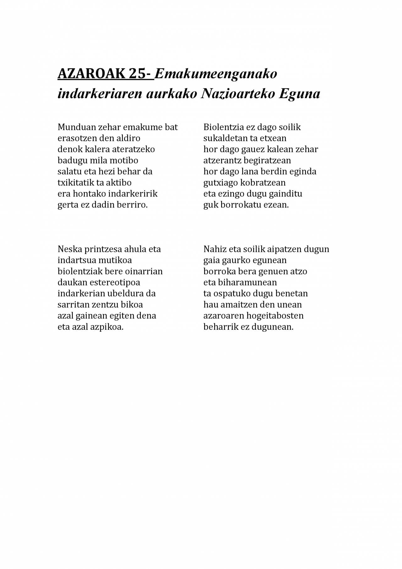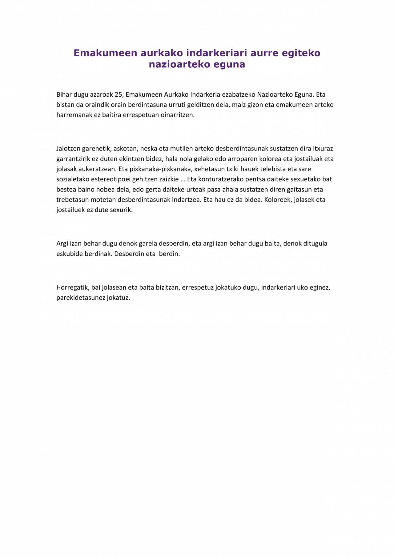 AZAROAK 25: EMAKUMEENGANAKO INDARKERIAREN AURKAKO NAZIOARTEKO EGUNA