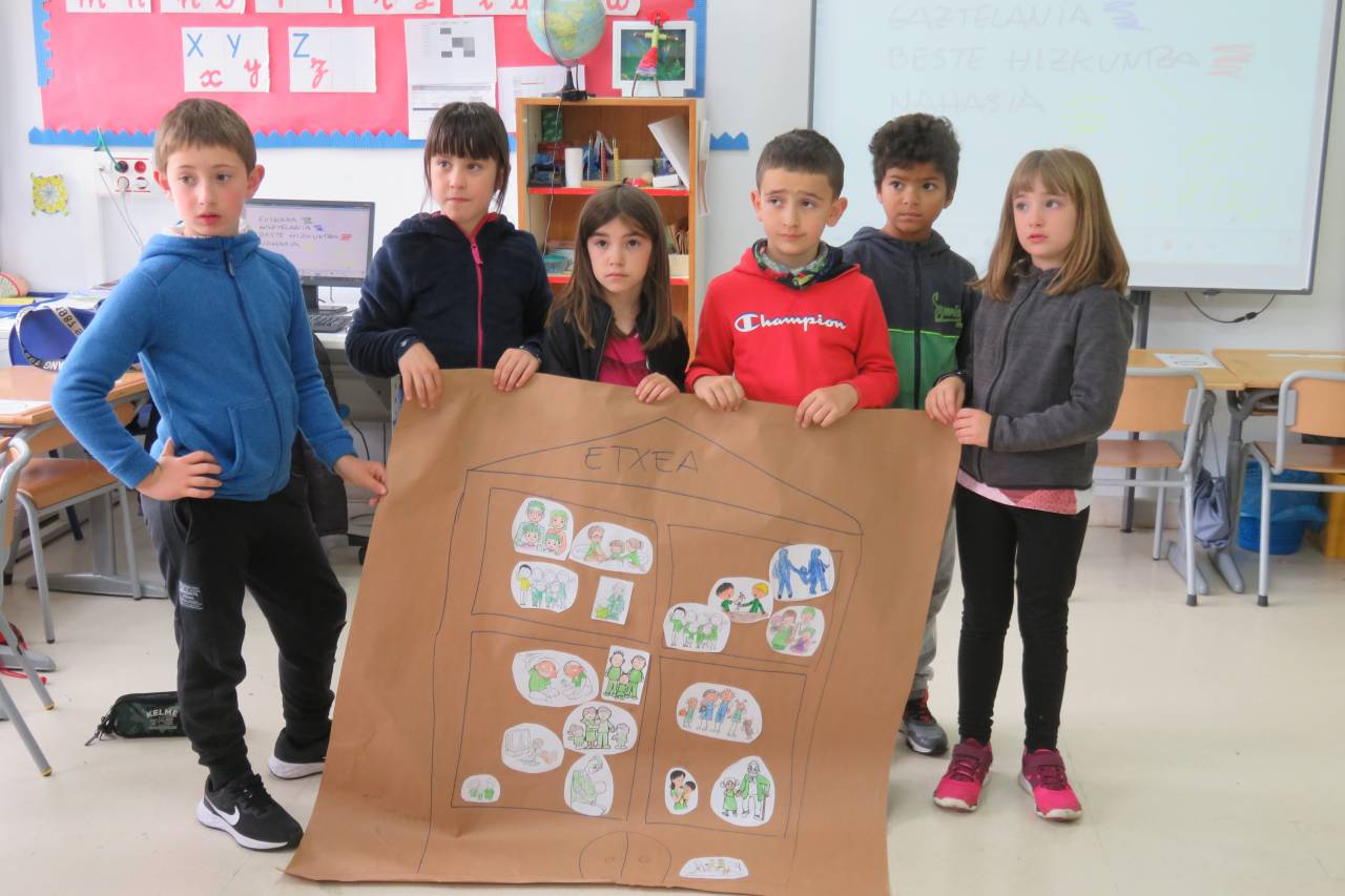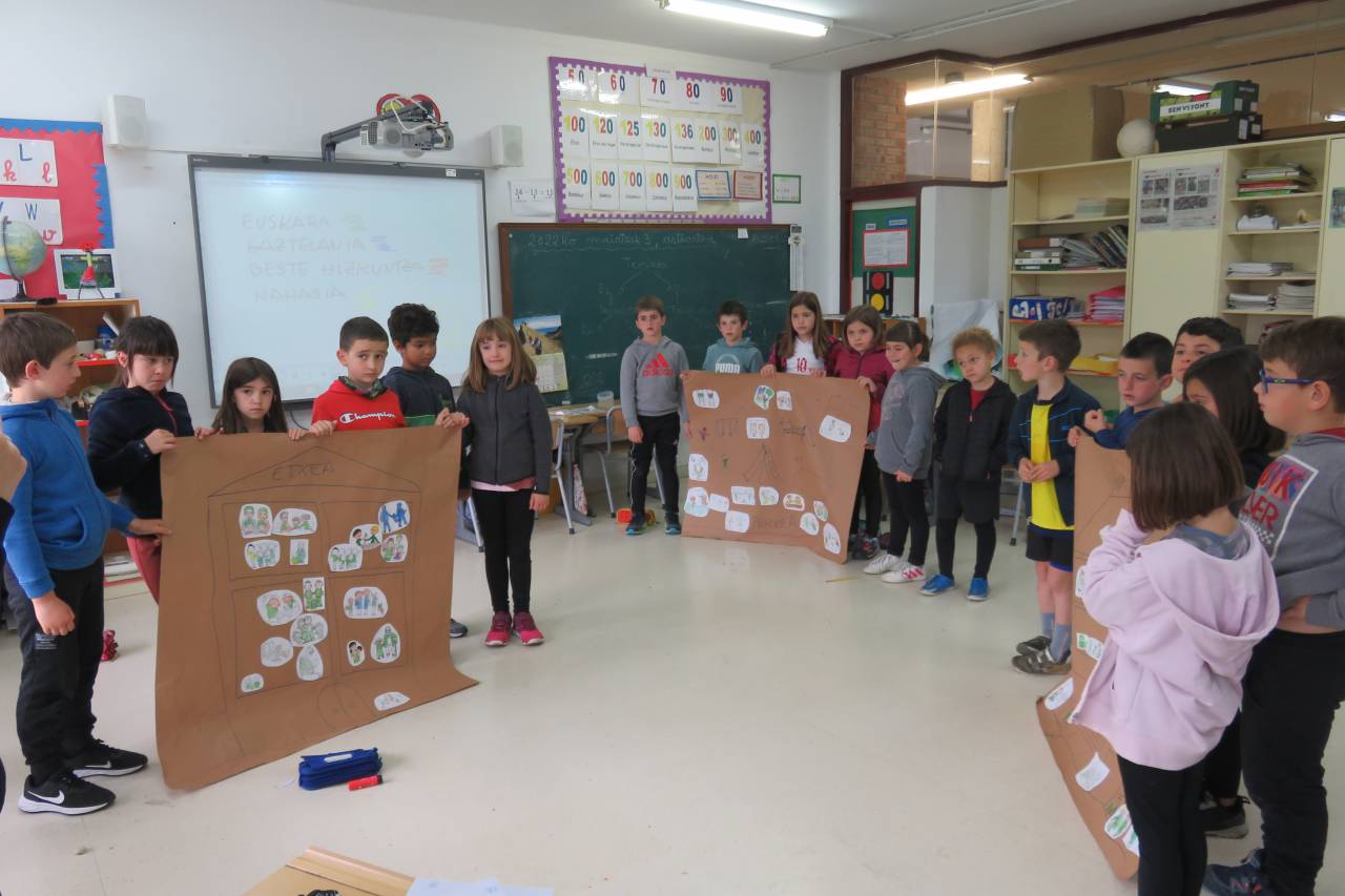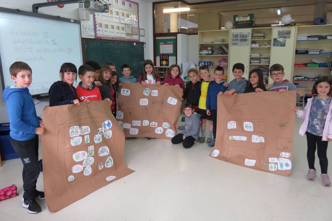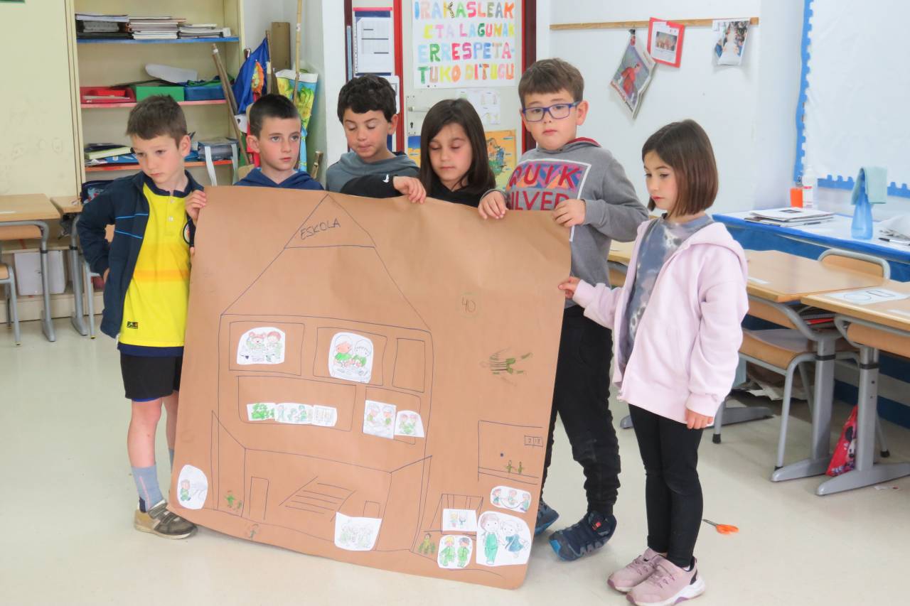 “Ispiluari begira tailerra egin dute LH2ko ikasleek, UEMA Udalerri Euskaldunen Mankomunitatearen laguntzarekin. Tailer honen helburua da haurrek eta haien inguruko pertsonek egunerokoan erabiltzen dituzten hizkuntzak identifikatzea. Horretarako, hiru mural osatu dituzte: etxea, eskola eta parkea. Hiru gune horietan erabiltzen eta entzuten dituzten hizkuntzak kontuan izanda, kolore batean edo bestean margotu dituzte irudiak. Horrela, ondorioztatu dute eskola dela beren egunerokoko gune euskaldunena. Parkean ere ia erabat egiten dute euskaraz; eta etxeko erabilera, altua den arren, baxuagoa da. Behin eskulanak eginda, ikasleek muralak eta haietatik ateratako ondorioak azaldu dituzte. Bideo bat prestatzen ari gara, LH2ko ikasleen guraso guztiek lanketaren berri izan dezaten.